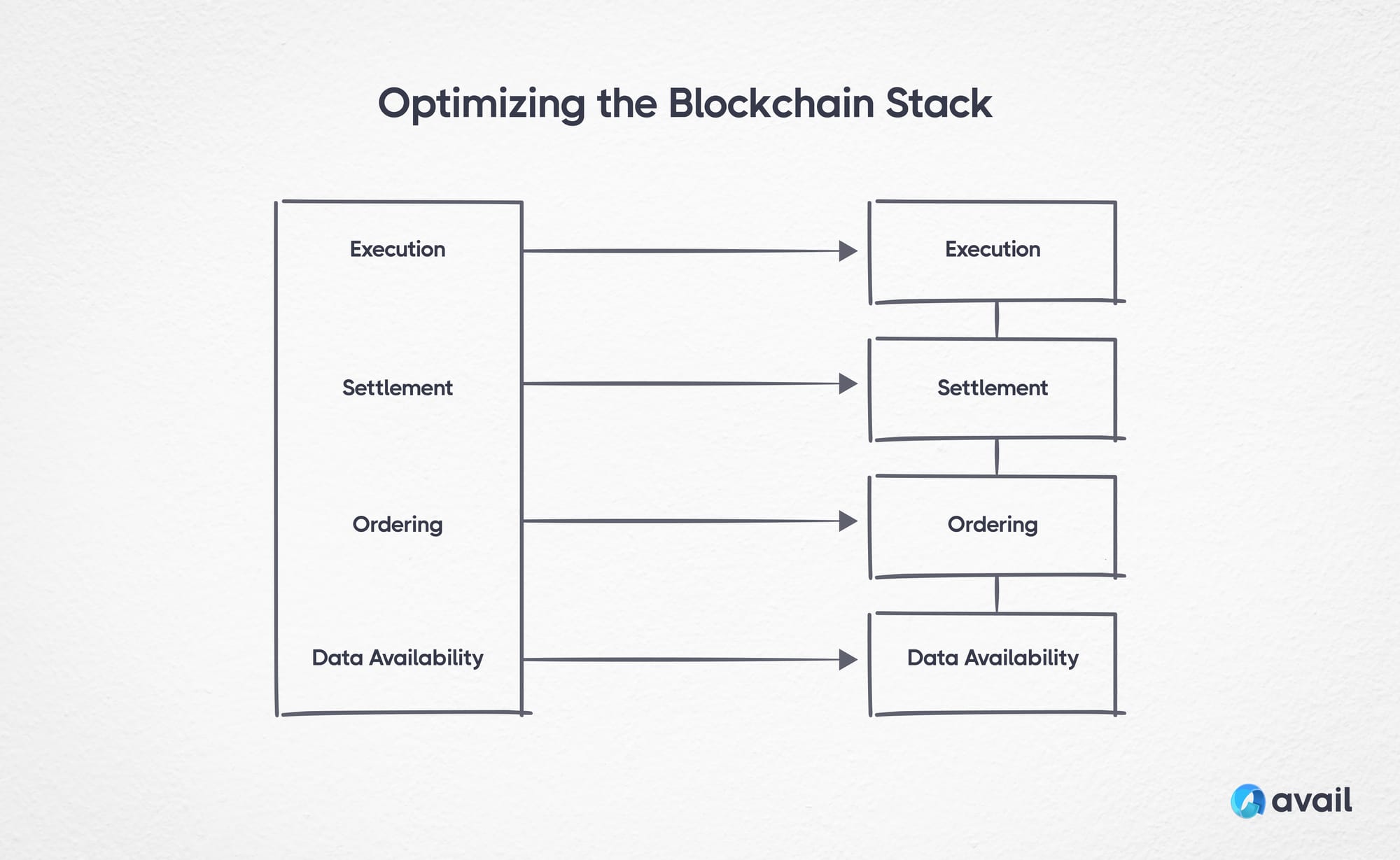 When building a Rollup or app-chain with Avail DA, you benefit from the separation of concerns principle which enables developers to break free from the blockchain scalability trilemma. This breakthrough lies in the ability to break up a blockchain’s stack into separate components where each is hyper-optimized to play a specific role within the stack, and then brought back together to function as a complete whole.