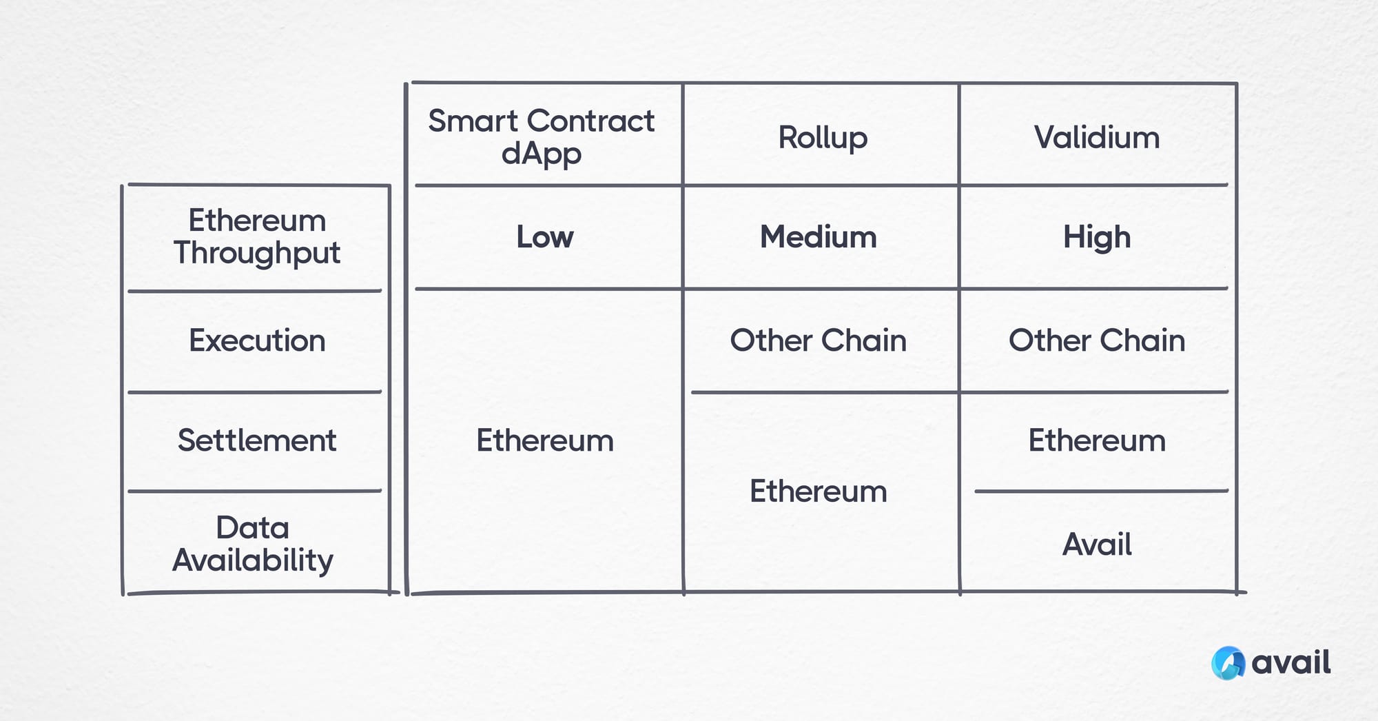 Rollups have massively scaled the amount of execution throughput possible within the Ethereum ecosystem by off-loading execution onto a separate Rollup’s blockchain. A proof of execution is usually sent to Ethereum along with the transaction data, placing massive upwards pressure on the demands for data availability, which is showing no signs of slowing down. Utilizing Avail DA helps increase the throughput possible on the Ethereum network, making Ethereum accessible to a whole lot more users.