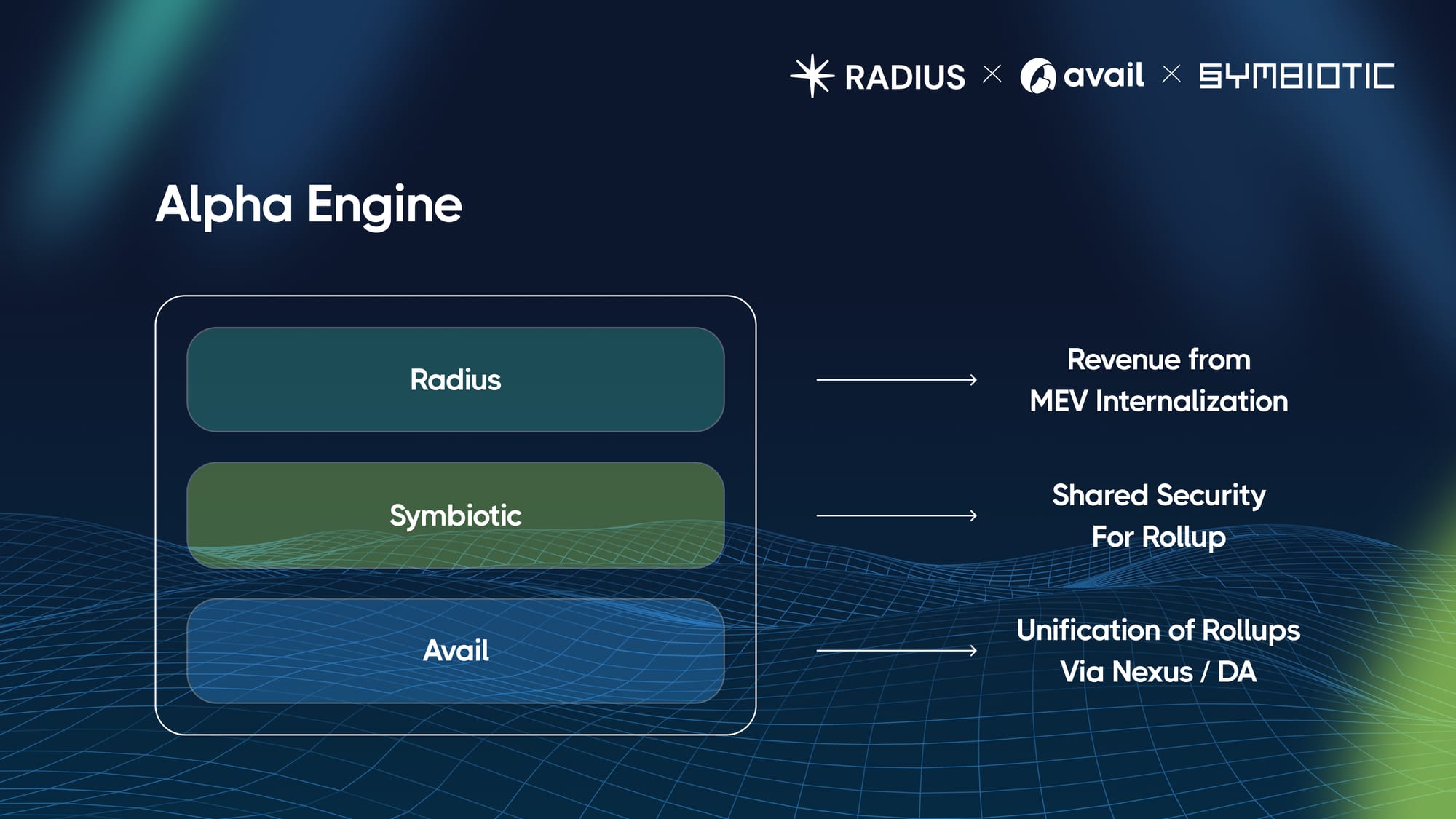 Rollups are revolutionizing blockchain scalability, but face a critical challenge, sustainable economic growth. Alpha Engine is a unique solution that brings together three powerful technologies to help fuel sustainable economic growth for rollups. Symbiotic, Avail and Radius combine to form Alpha Engine, providing the essential tools that rollups need to scale efficiently and securely, while capturing additional network revenue.