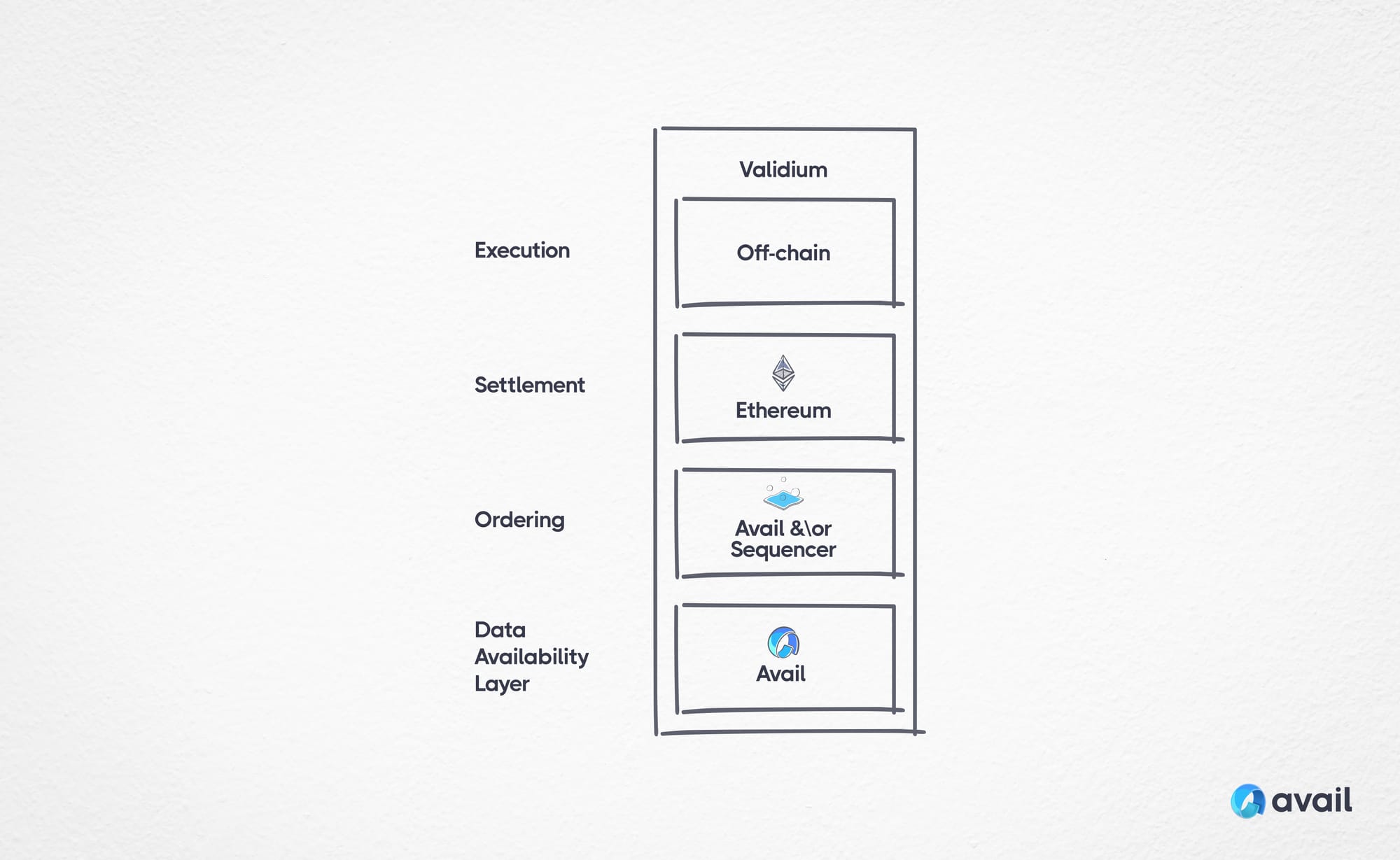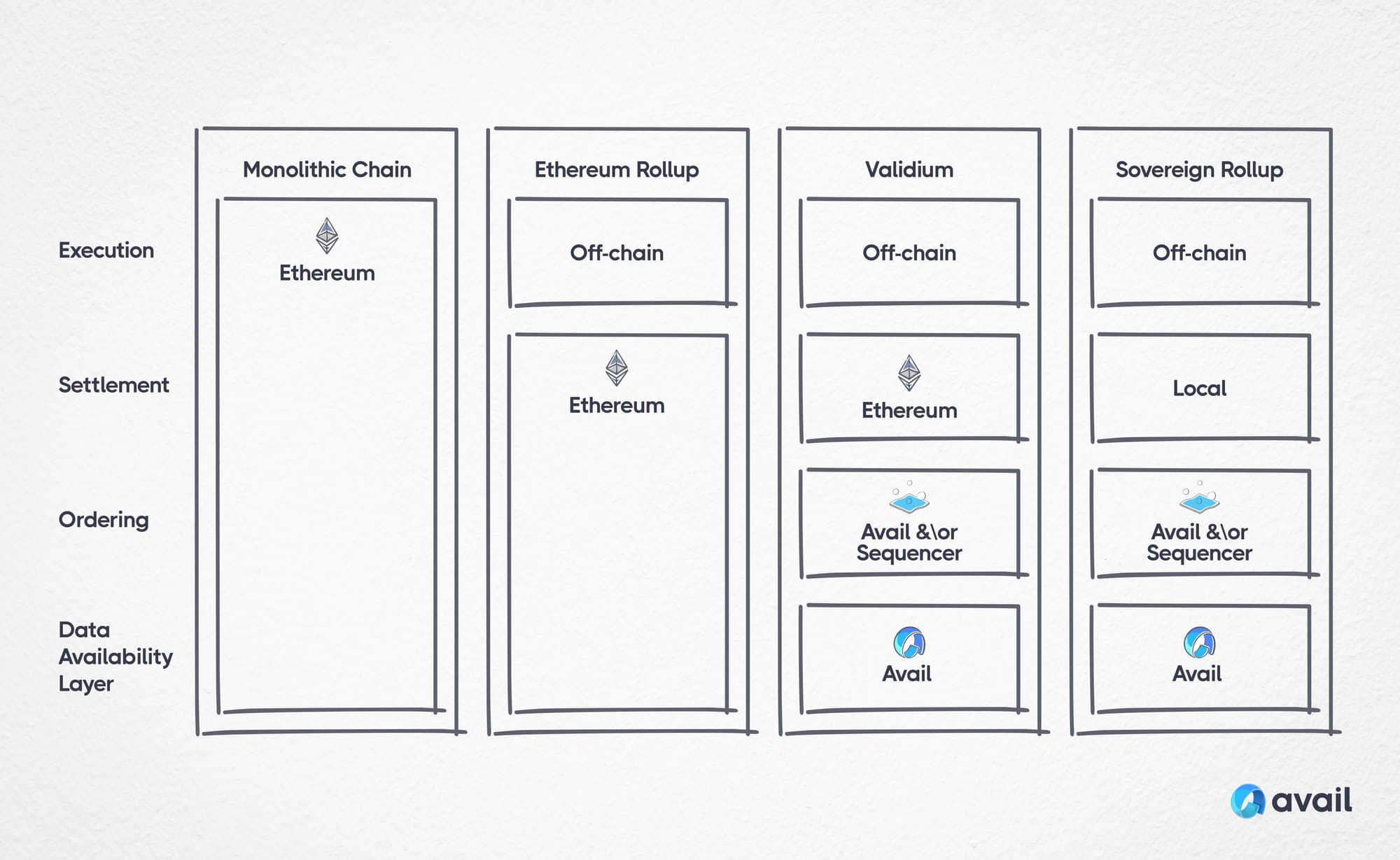 A rollup choosing to use Avail to publish transaction data off-chain turns into a Validium (or Optimium if it's an optimistic based rollup). Validiums and Sovereign Rollups can rely on Avail for trust-minimized data availability and ordering.
