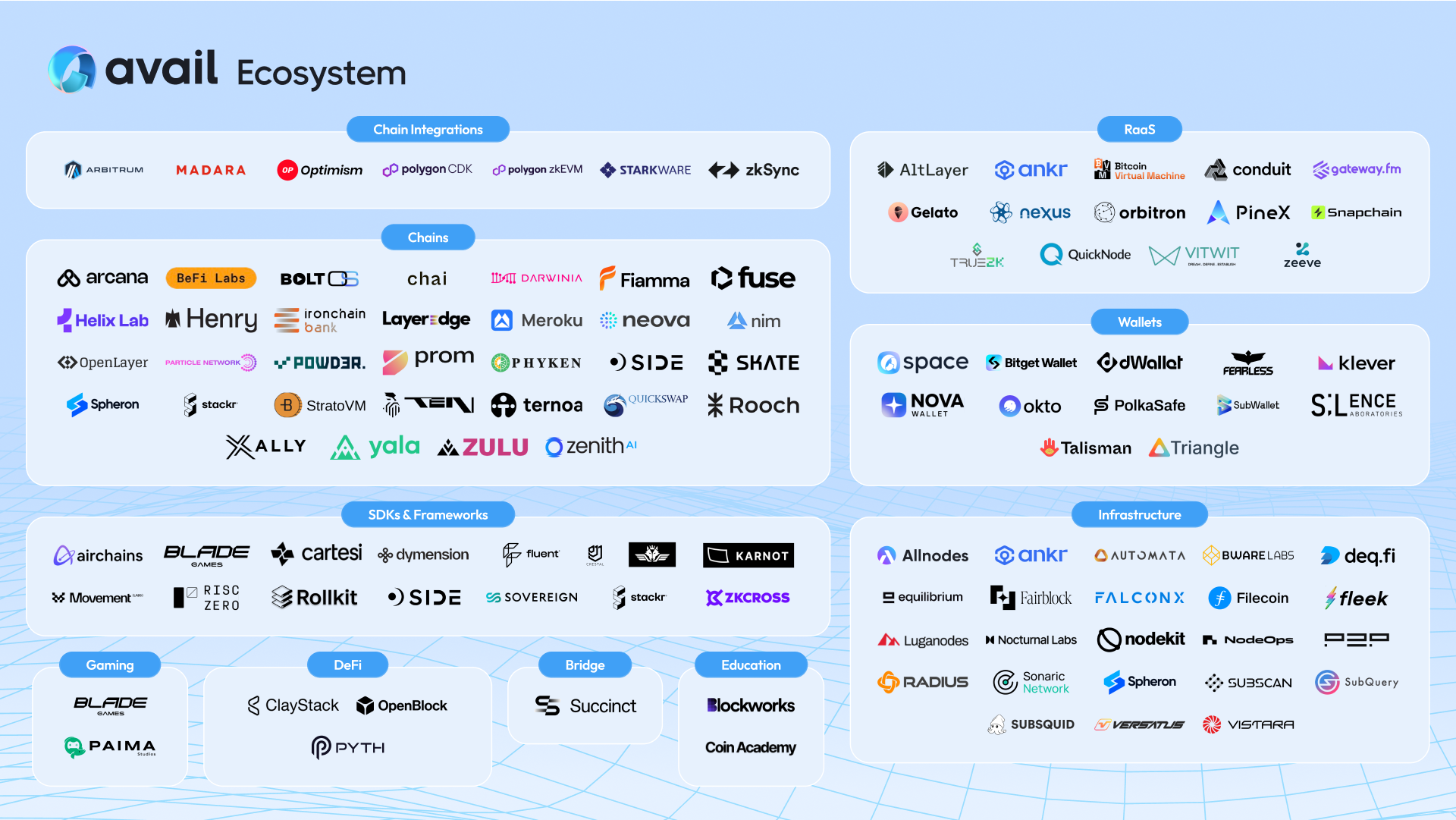 Over the past few months, Avail has worked hand-in-hand with the growing community to bring this vision to life securing more than 70 partnerships. This includes the 5 largest L2 ecosystems, making Avail DA accessible to developers building on Arbitrum, Optimism, Polygon, Starkware and ZKsync.
