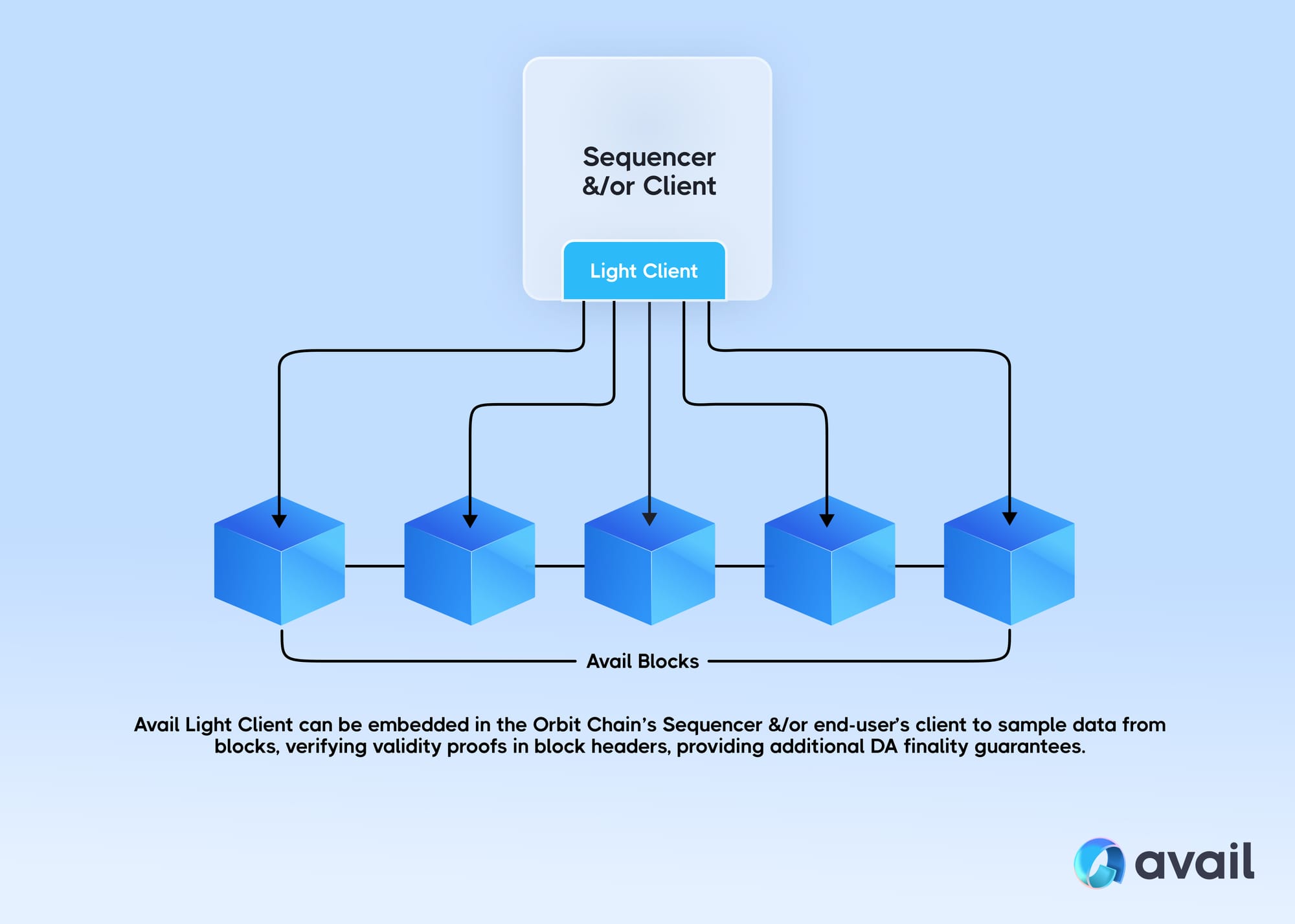 The Avail Light Client has the ability to sample data from the Avail blockchain and could be embedded in the Orbit Chain’s sequencer, Validator or even the end-user’s client. Doing so provides the ability to independently verify that data for the Orbit chain is being made available on Avail without having to trust any other party.
