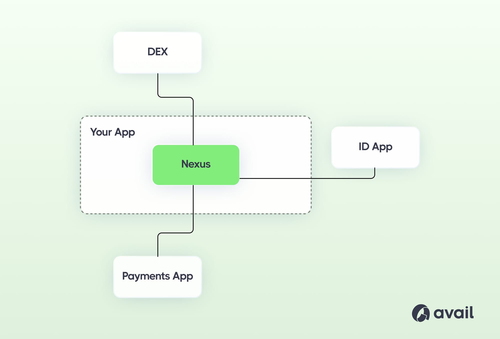 Crosschain functionality is not limited to assets and users, but applications too. If a user connects to an app powered by Avail Nexus, they can also tap into the applications that are integrated with Nexus too. This creates a connected modular application stack where interoperability is not an afterthought but built in from the ground up. Launching a new chain no longer requires also launching a DEX, Payment Network, ID platform and other apps to create a new, but separate ecosystem. Every App that’s connected becomes seamlessly integrated within a modular application stack, where apps fit together like lego blocks.
