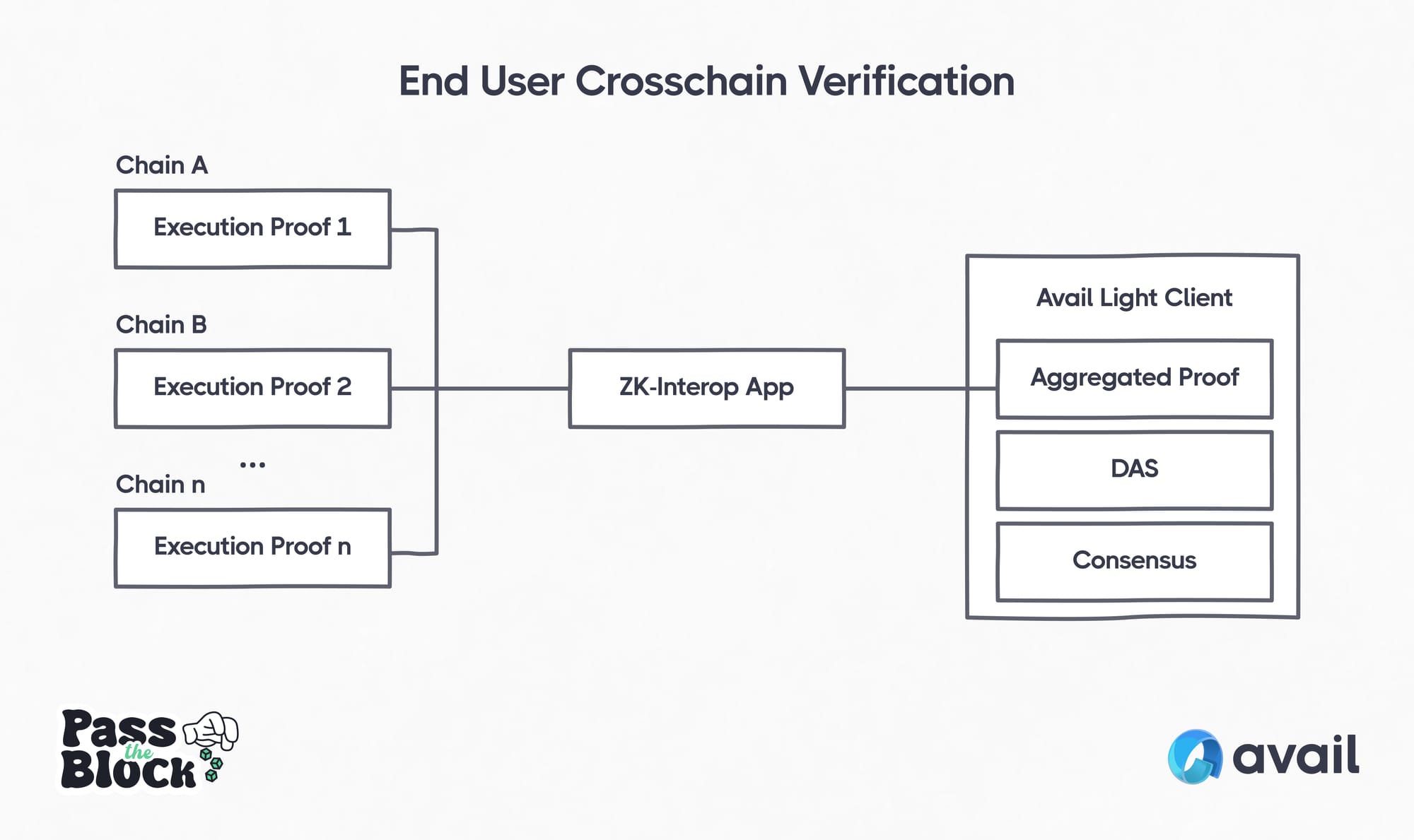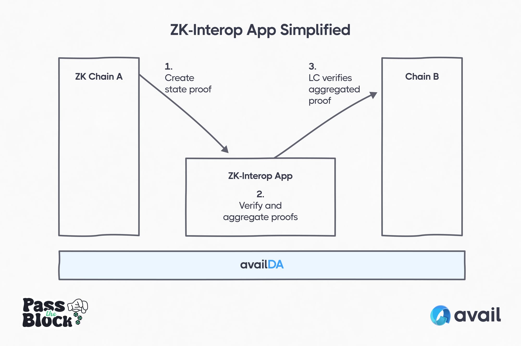 At its core, the ZK-Interop App verifies and aggregates state proofs from multiple chains into a single ZK proof. Users can then verify the aggregated ZK proof with the Avail Light Client to verify the state of all participating chains. This is an optimal architecture for crosschain transactions, as every user within a decentralized network from individuals to institutions could independently verify transactions with the certainty that comes from running a full node, all without needing to trust any individual or entity.