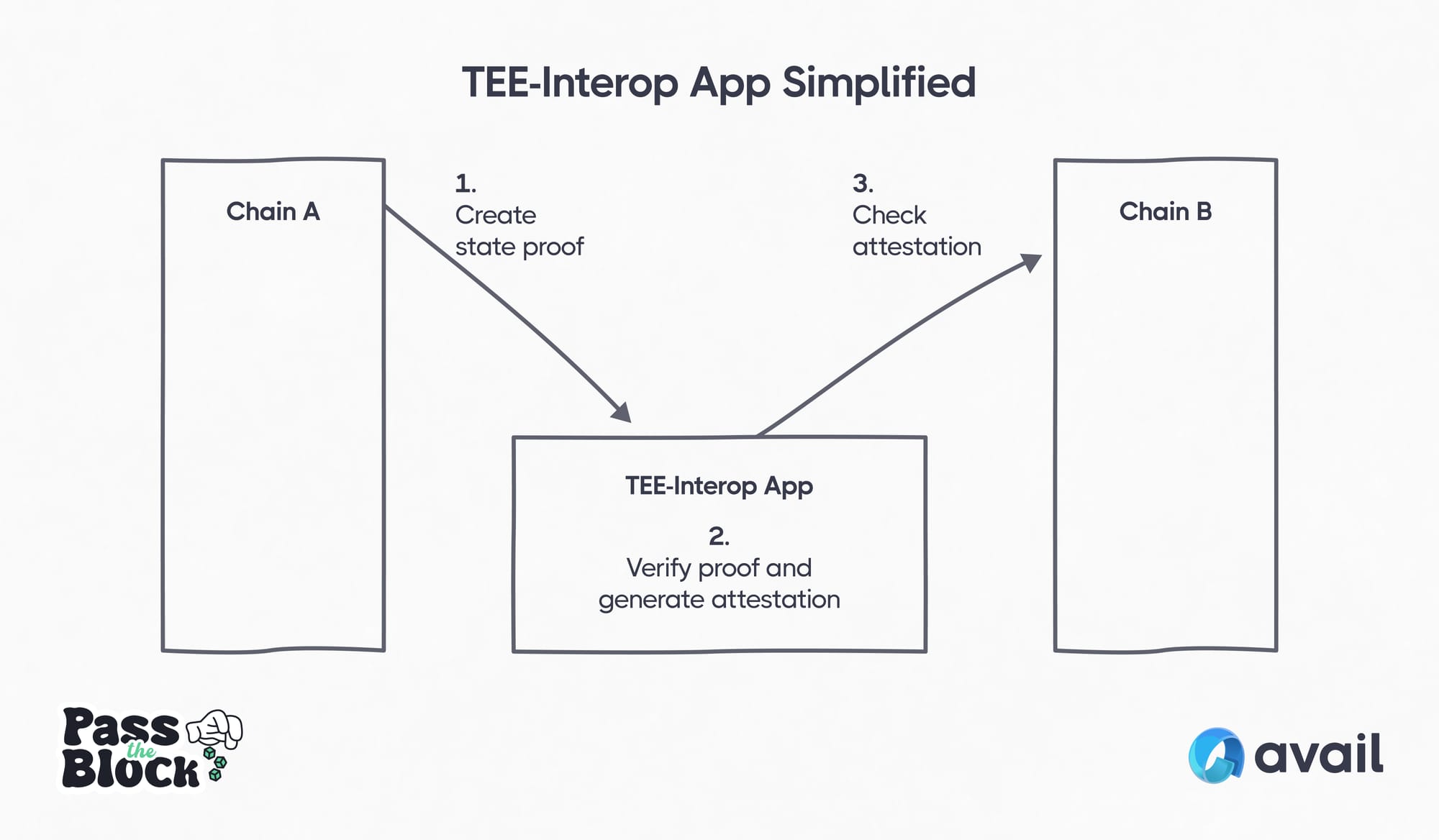 The TEE-Interop App uses Trusted Execution Environments (TEE) that protect code and data from malicious actors by running on secure hardware. The TEE-Interop App verifies state from participating chains and generates cryptographic attestations that are used for settling transactions.