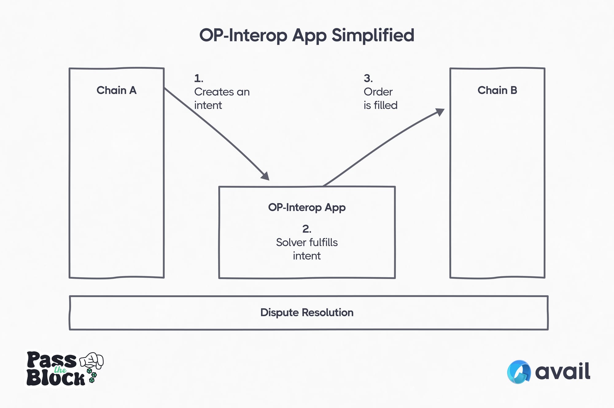 When a user initiates a crosschain transaction with the OP-Interop App, an intent is issued based on the ERC-7683 standard. The intent acts like an order ticket that solvers compete to fill. The solver role will be decentralized to the community over time so that community operators, like those running on Symbiotic for example, could run as solvers for Avail Nexus transactions.