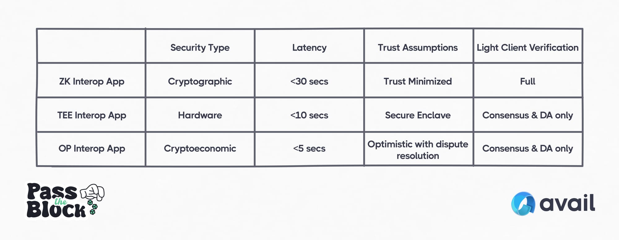 ZK rollups on Avail offer the most trust-minimized interoperability, as every user running a light client can independently verify transactions without relying on any other entity. For applications and users that prioritize trust minimization, this will be their preferred choice.