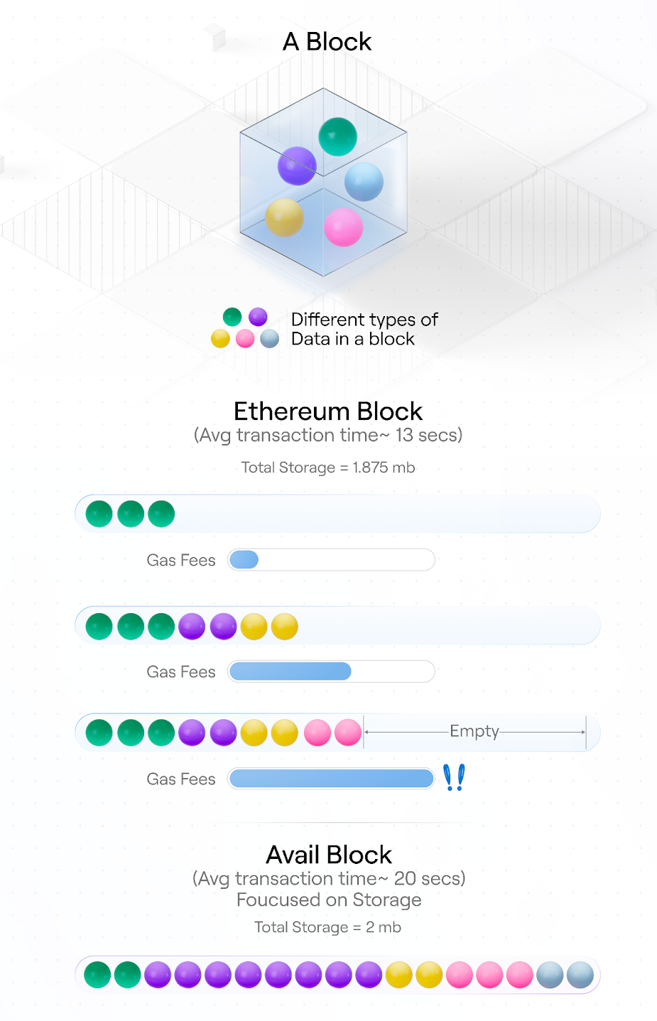 The need to combine execution, settlement, and data availability in the same block is the core problem with monolithic blockchain architectures. Layer-2 (L2) rollups started the modular blockchain movement by allowing execution to be handled on a separate chain, with blocks dedicated solely to execution. Avail takes modular design one step further by decoupling data availability, as well, and allowing for a chain with blocks dedicated solely to data availability.