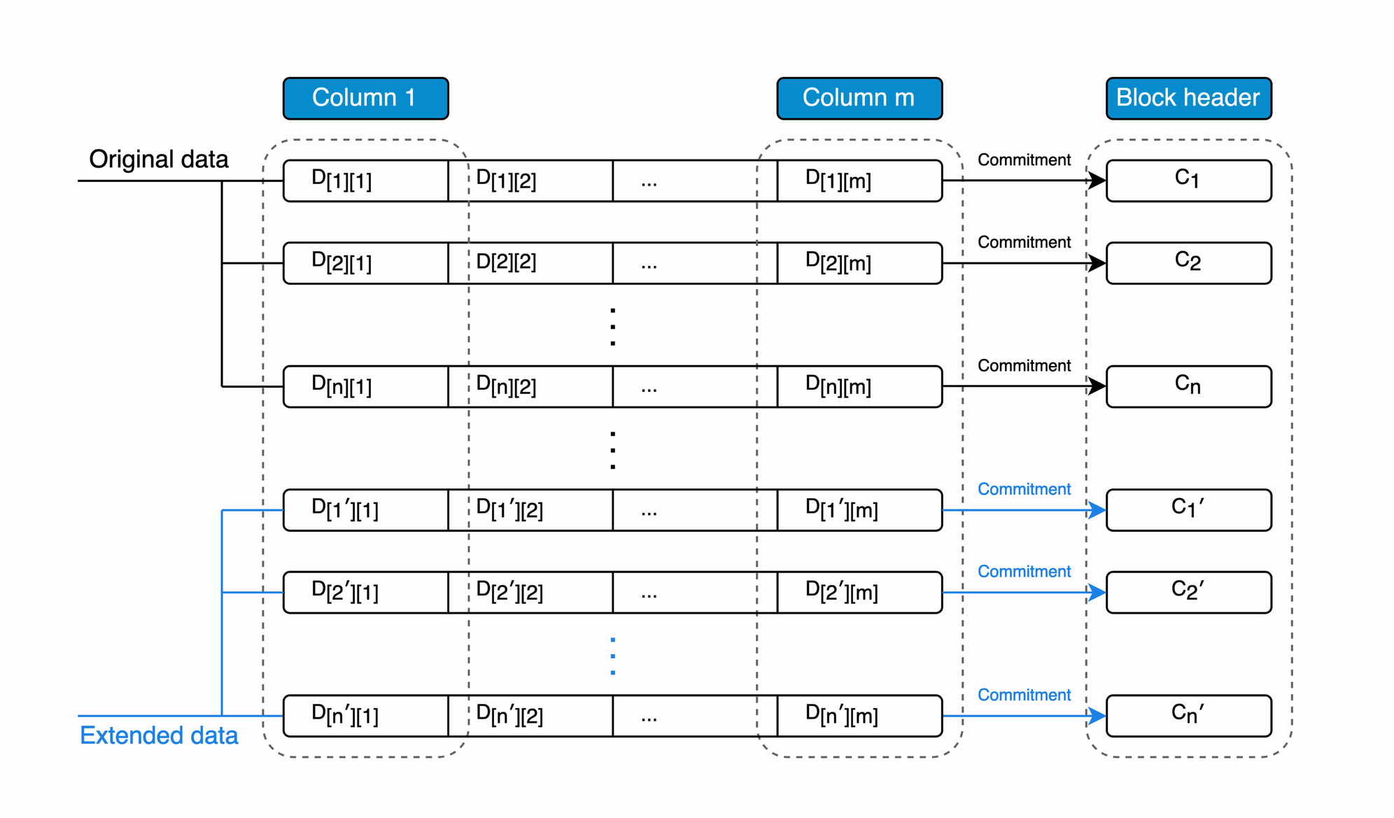 - Verify: They then look at the commitment in the block header (which light clients always have access to), and verify the proof for each cell against the commitment.