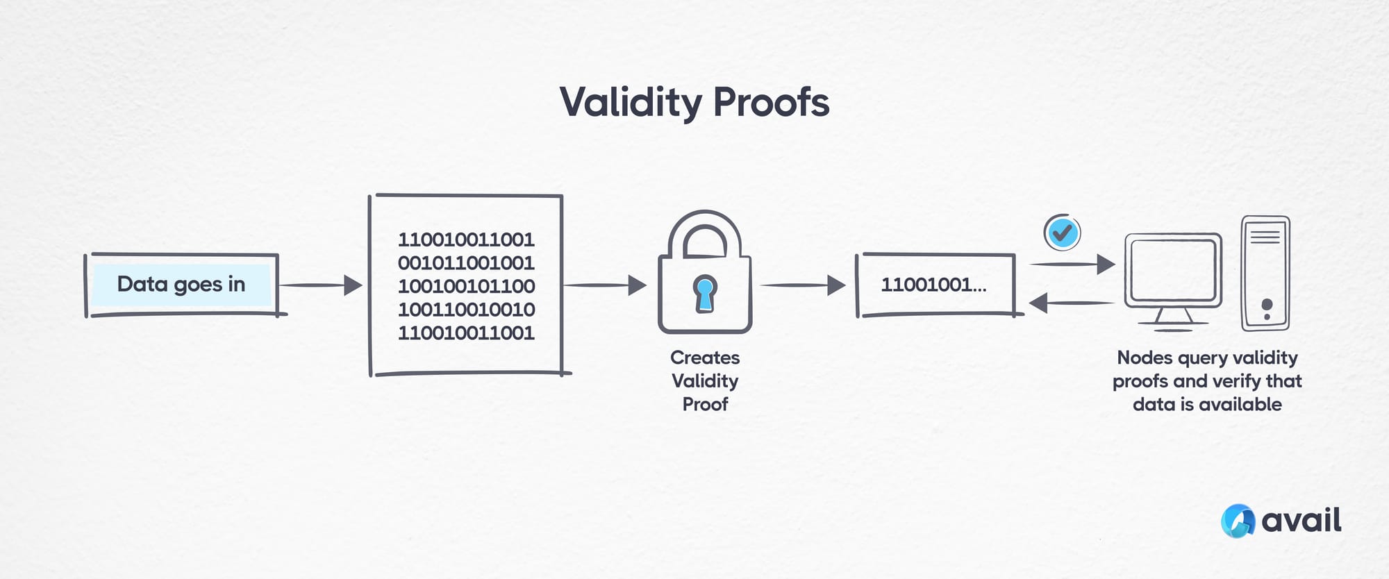 Blockchain nodes need data availability guarantees when committing new blocks to a blockchain. Inspired by the cryptographic security of ZK-technology, Avail uses validity proofs (KZG commitments) so that developers and users don’t need to trust Avail that data is available, they can verify it for themselves.