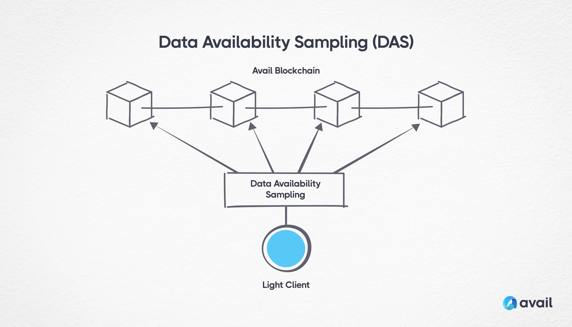 Data Availability Sampling leverages light clients, validity proofs and erasure coding to randomly sample data from the Avail blockchain and generate a confidence score. The light client can quickly generate data availability guarantees very close to 100% with 8-30 samples.