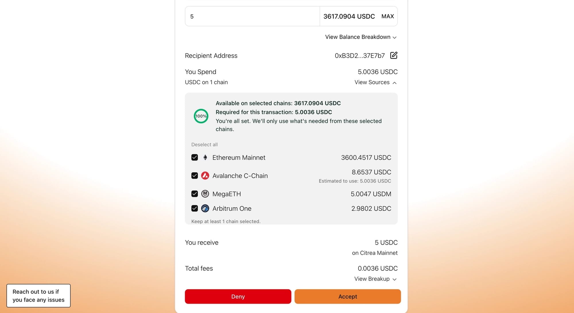 - You can deselect individual source chains from the balance breakdown if you want to control which chains you draw from – FastBridge recalculates in real time.