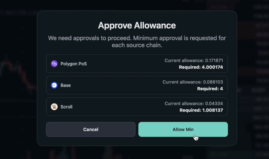 The user controls how much of their token balance can be accessed during the transaction process, with the minimum amount selected by default. This is particularly important for users with large balances on multiple chains who don’t want to approve access to their entire balance.