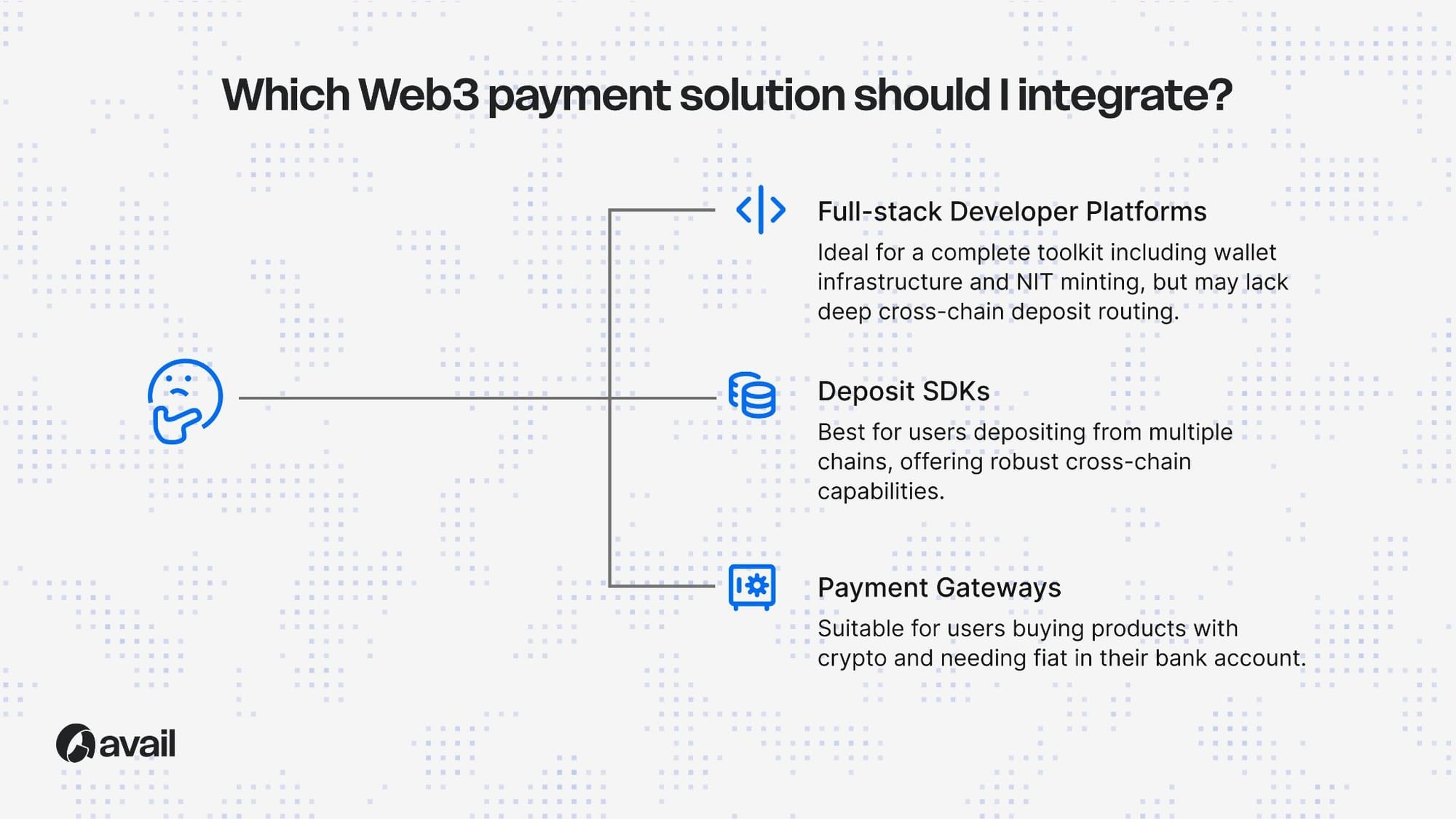 For traditional crypto payments, use a payment gateway like BitPay or Coinbase Commerce. They offer plugins for Shopify, WooCommerce, and other platforms. For cross-chain web3 payments where users deposit into smart contracts, integrate the Avail Deposits SDK. It handles bridging, gas, and swaps automatically across all major EVM chains.