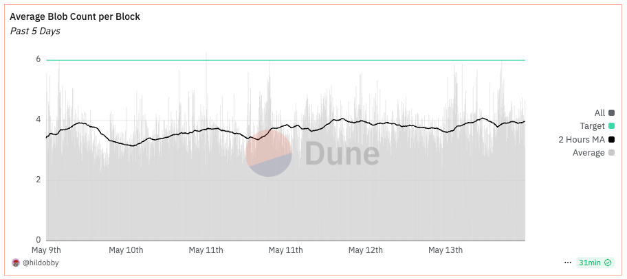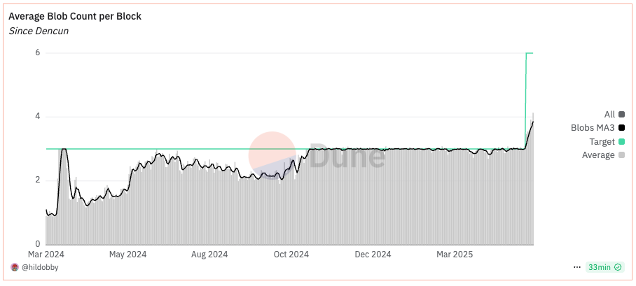 In just a week since the Pectra upgrade, Ethereum’s blob usage has gone from an average of ~3 blobs per block to almost 4. In other words, in just 7 days approximately ⅓ of the increased capacity is already being consumed, suggesting the embrace of validiums and optimiums needs to happen sooner rather than later.