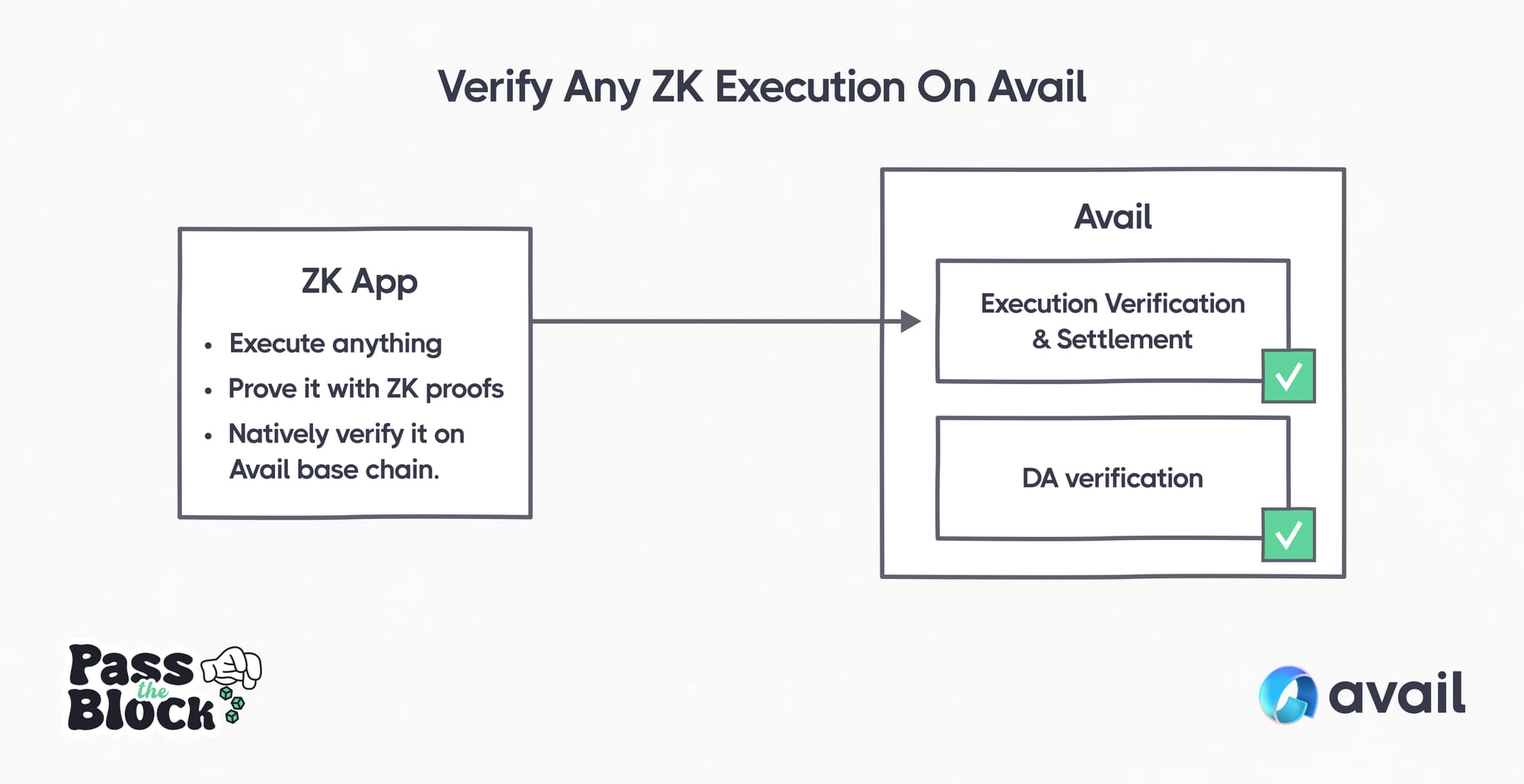 Rather than executing the transactions on-chain and clogging up the network, the computation for Avail’s execution layer is run off-chain, then verified onchain with ZK proofs for settlement.