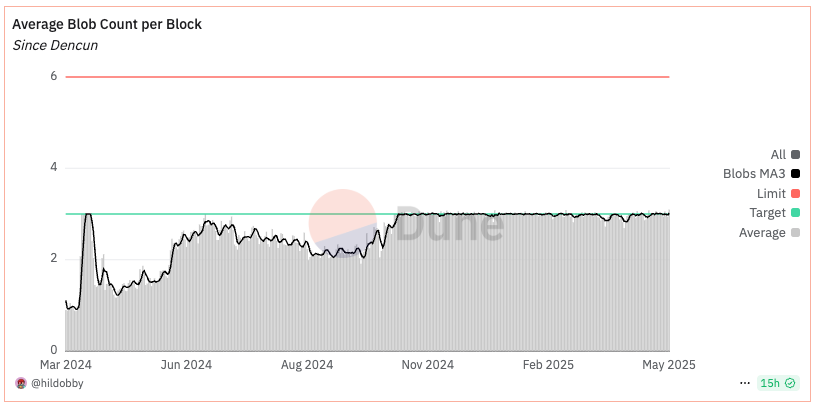 With Pectra live, we can expect utilization to increase towards the new target of 6 blobs per block, with the upper limit rising to 9.